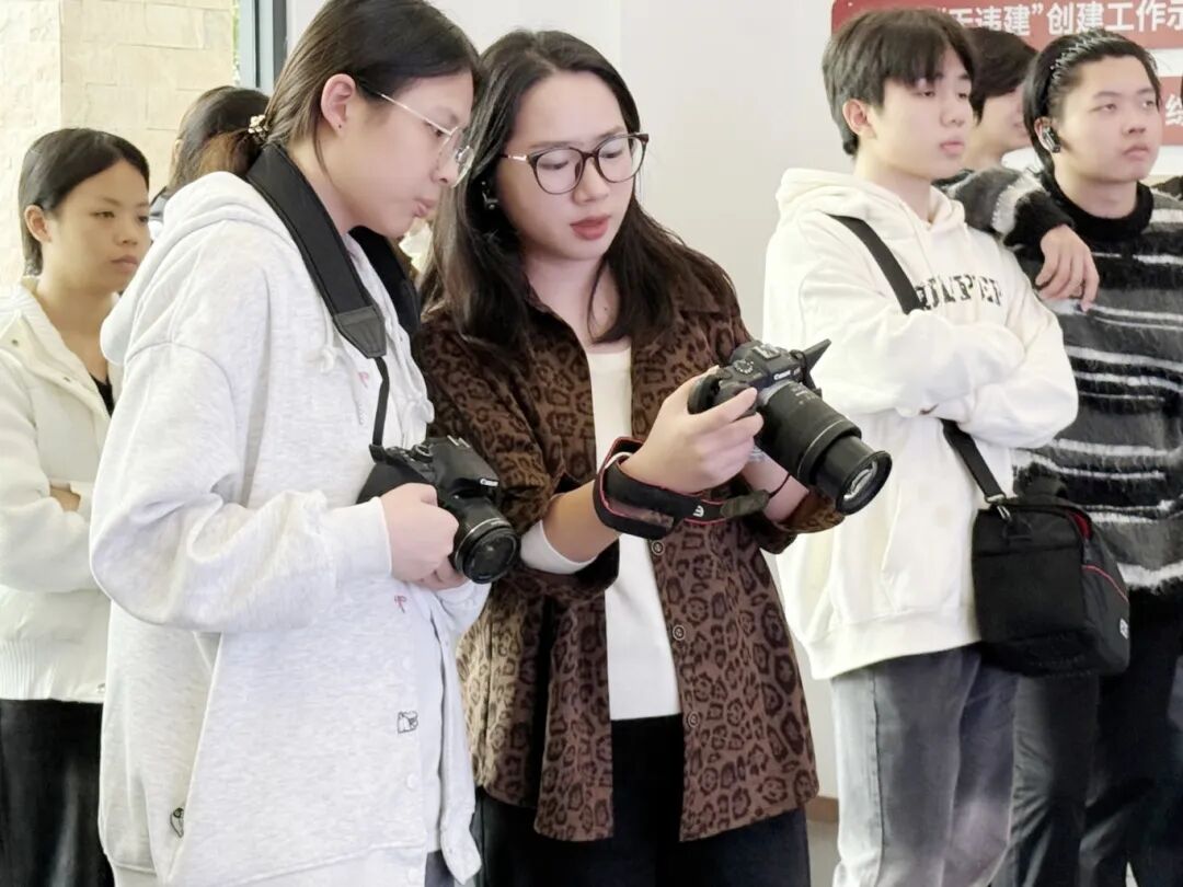 遇到构图、运镜等疑问,同学们立刻围到指导老师身边,举着相机屏幕请教调整方法。指导老师现场答疑、精准指导,引导大家观察生活、提炼主题,让“被动听课”变为“主动创作”。同学们纷纷表示,这种“行走的课堂”让理论学习更接地气,不仅提升了专业技能,更深刻体会到数字媒体在文化传播中的独特价值。