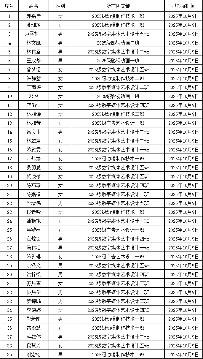 根据相关文件要求,经学生本人申请、团支部推荐、组织审查考核、文创学院2025年下半年拟发展39名同学为共青团员,现将拟发展人员名单公示如下: